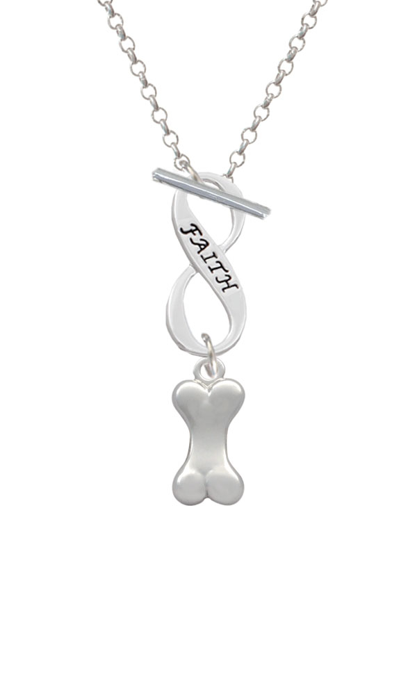 Silver Tone 3-D Dog Bone Faith Infinity Toggle Necklace. Silver Tone charm. 3mm Rolo Chain Necklace is 18 inches long. Infinity Toggle is approx. 0.90 x 0.40 x 0.10 inches (HxWxD). The infinity symbol represents the quality of being limitless or endless. Choose your favorite message to represent your love, faith, or commitment that lasts forever. Please Note: Our products are lead safe, but are not intended for children 14 years and younger.