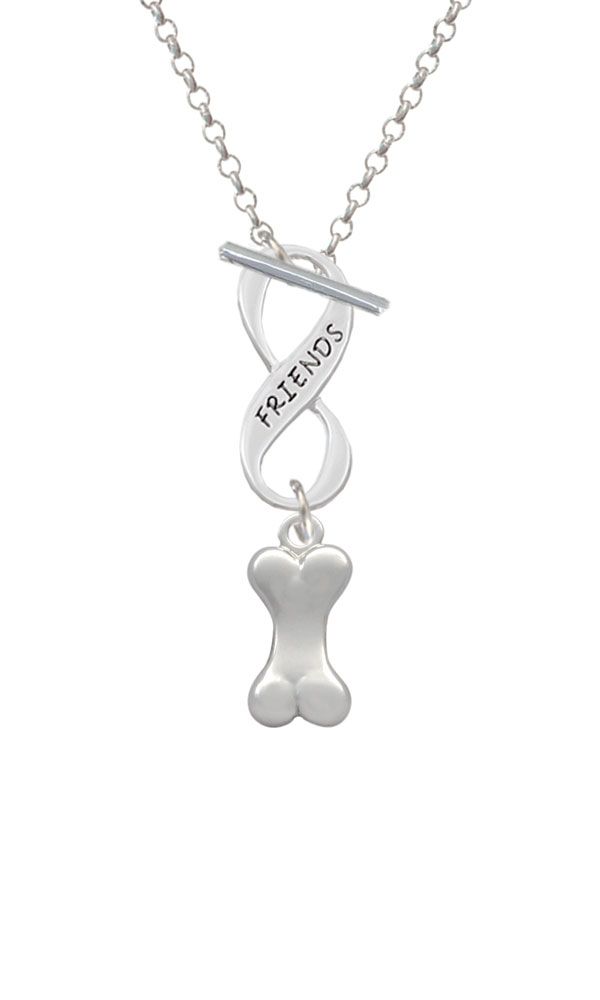 Silver Tone 3-D Dog Bone Friends Infinity Toggle Necklace. Silver Tone charm. 3mm Rolo Chain Necklace is 18 inches long. Infinity Toggle is approx. 0.90 x 0.40 x 0.10 inches (HxWxD). The infinity symbol represents the quality of being limitless or endless. Choose your favorite message to represent your love, faith, or commitment that lasts forever. Please Note: Our products are lead safe, but are not intended for children 14 years and younger.