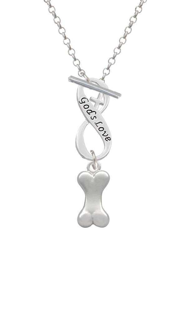 Silver Tone 3-D Dog Bone God’s Love Infinity Toggle Necklace. Silver Tone charm. 3mm Rolo Chain Necklace is 18 inches long. Infinity Toggle is approx. 0.90 x 0.40 x 0.10 inches (HxWxD). The infinity symbol represents the quality of being limitless or endless. Choose your favorite message to represent your love, faith, or commitment that lasts forever. Please Note: Our products are lead safe, but are not intended for children 14 years and younger.