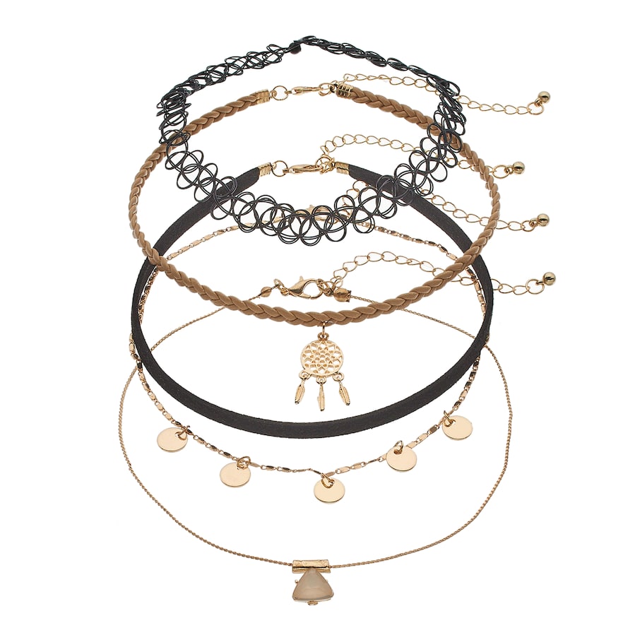 Trendy style abounds on this choker necklace set.SET Details Lengths: 12 in. with 3-in. extender (each) Pendant length: 1 in. Clasp: lobster-claw Base metal: iron Plating: gold tone Additional details: nickel free Not appropriate for children 14 years old and younger. Size: One Size. Gender: Female. Age Group: Adult.