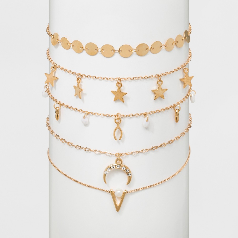 Choker necklace set comes with 5 different chokers featuring charms like discs, stars and wishbones. All come in gold and have lobster claw clasps for closures. Gender: Female. Pattern: Solid.