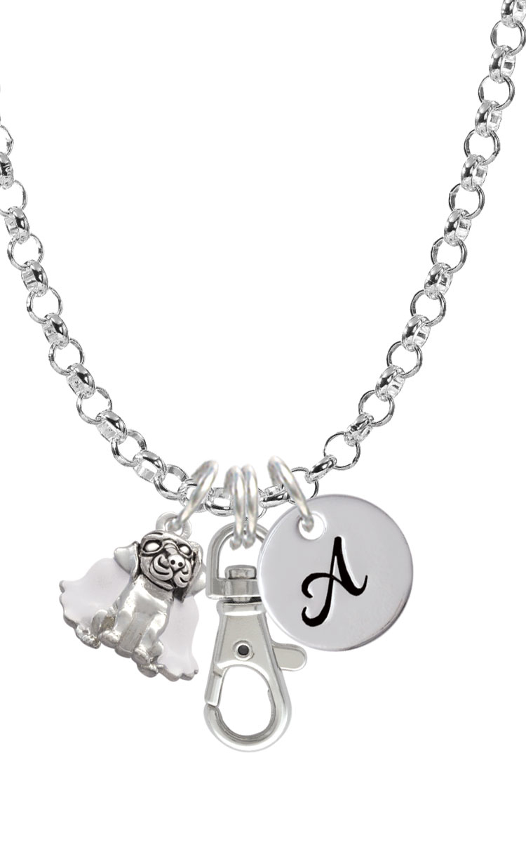 Silver Tone Dog Angel Initial Badge Clip Necklace. Silver Tone, hand enameled charms. Charm size is approx. 0.81 x 0.77 x 0.3 inches (HxWxD) including loop. 5 mm Rolo Chain Necklace: 34 Inches. Large Swivel Clip is approx. 1.43 x 0.65 x 0.25 Inches (HxWxD). Dress up your ID with this beautiful and unique necklace. Please Note: Our products are lead safe, but are not intended for children 14 years and younger.