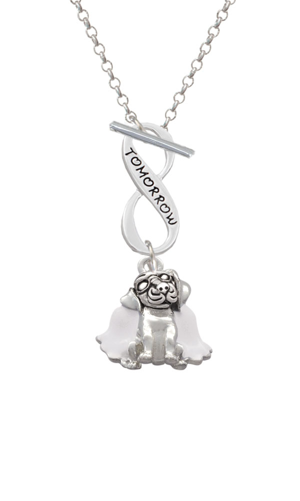 Silver Tone Dog Angel Today Tomorrow Infinity Toggle Necklace. Silver Tone, hand enameled charms. Charm size is approx. 0.81 x 0.77 x 0.3 inches (HxWxD) including loop. 3mm Rolo Chain Necklace is 18 inches long. Infinity Toggle is approx. 0.90 x 0.40 x 0.10 inches (HxWxD). The infinity symbol represents the quality of being limitless or endless. Choose your favorite message to represent your love, faith, or commitment that lasts forever. Please Note: Our products are lead safe, but are not intended for children 14 years and younger.