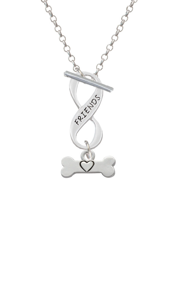 Silver Tone Dog Bone with Heart Friends Infinity Toggle Necklace. Silver Tone, hand enameled charms. Charm size is approx. 0.35 x 0.64 x 0.06 inches (HxWxD) including loop. 3mm Rolo Chain Necklace is 18 inches long. Infinity Toggle is approx. 0.90 x 0.40 x 0.10 inches (HxWxD). The infinity symbol represents the quality of being limitless or endless. Choose your favorite message to represent your love, faith, or commitment that lasts forever. Please Note: Our products are lead safe, but are not intended for children 14 years and younger.