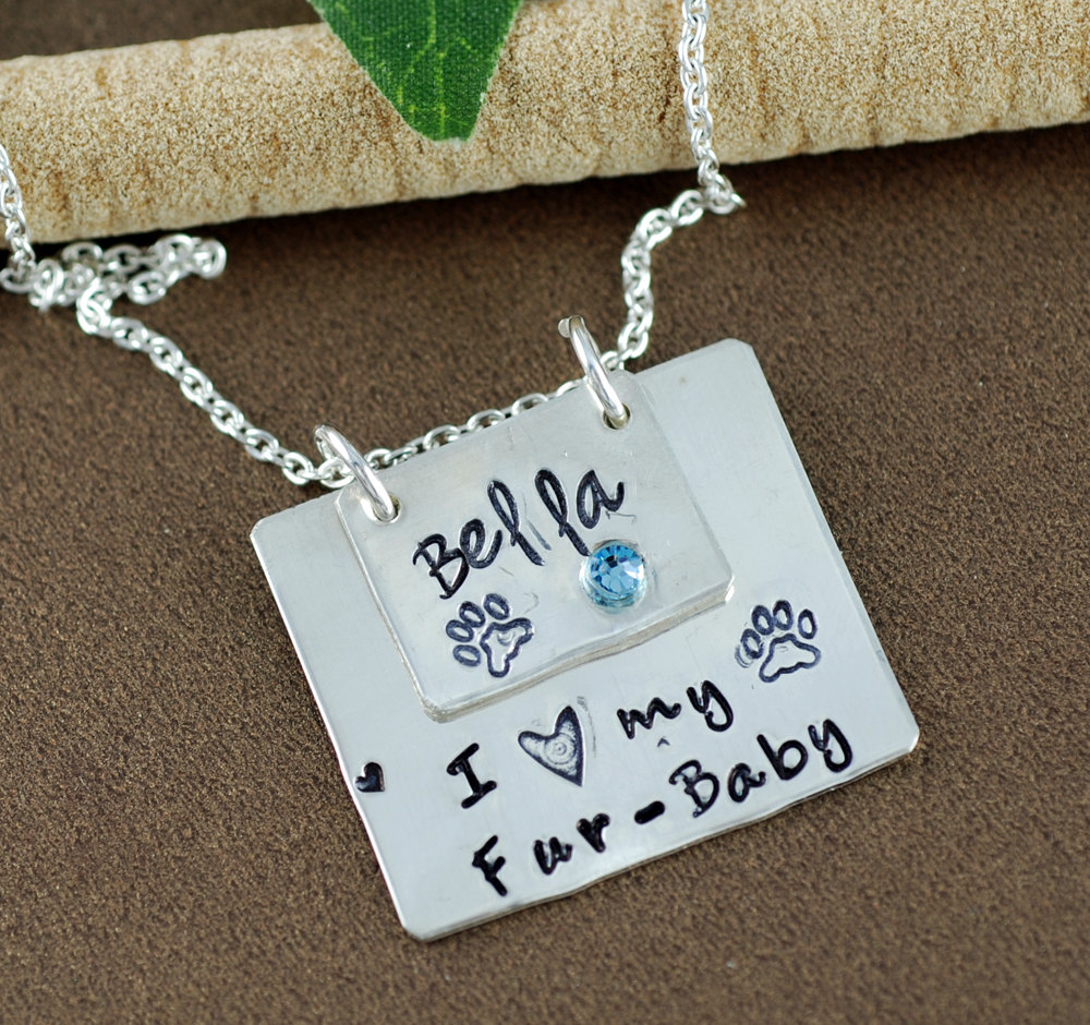 Dog Mom Necklace, Pet Lover Necklace, I love my Furbaby Necklace, Hand Stamped Bar Jewelry, Birthstone Name Necklace, Dog Paw Necklace NEW DESIGN Details for this Layered Sterling Silver Necklace ** Sterling Silver Cable Link Chain ** Top Sterling Silver Rectangle Disc (measures 1/2″ x 5/8″) – (Pet Name with Paw Print and birthstone of your choice) ** Bottom Sterling Silver Rectangle Disc (measures 3/4″ x 1″) – Name of your choice ** Birthstone Please let us know the stamping you would like in the note to seller box when you check out. Custom Orders are welcome. If you have any questions or requests please contact me through CONVO Each pendant and stamping are done by hand so please know that each letter or name might not line up perfectly. Also, some letters might be deeper than others. This is not a defect. It adds character to each piece. Made with sterling silver materials. Each necklace is packaged in our custom Annie Reh Designs gift box tied with a ribbon and with a complimentary polish pad to shine your necklace when needed.