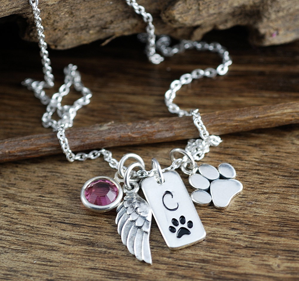 Dog Necklace Personalized, Dog Paw Jewelry, Angel Wing Necklace, Loss of Pet, Paw Print Necklace, Pet Memorial, Dog Mom Jewelry Details for Necklace: * Sterling Silver Chain * ONE birthstone * Sterling Silver Angel Wing Charm * Sterling Silver Rectangle Paw Bar with Initial (measures approx 3/4H”) * Sterling Silver Dog Paw Charm HOW TO Order: 1. Select Chain Length 2. Select Birthstone 3. Please let us know the initial you would like stamped in the note to seller box. at check out A perfect gift for that special someone! Or treat yourself to a beautiful necklace. Each pendant and stamping are done by hand so please know that each letter or name might not line up perfectly. Also, some letters might be deeper than others. This is not a defect. It adds character to each piece. All material Is Sterling Silver Throughout! Thank you Annie Reh