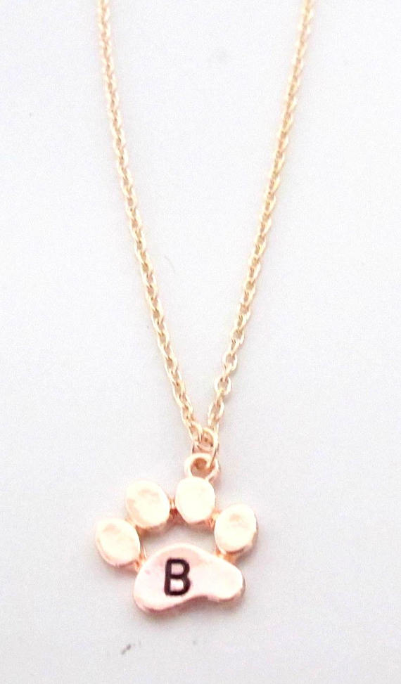 Js132 Dog Necklace Personalized, Dog Paw Necklace, Dog Jewelry, Paw Print, Pet Memorial, Pet Loss Necklace, Dog Lover Gift, Dog Mom, Cat Lover Necklace, Dog Paw Charm. This is a Rose Gold Finish Dog Paw Charm Necklace with Hand Stamped Initial of the Pet. A great gift for pet lovers, dog lovers. Custom Personalized hand stamped Dog/Cat Initial jewelry.