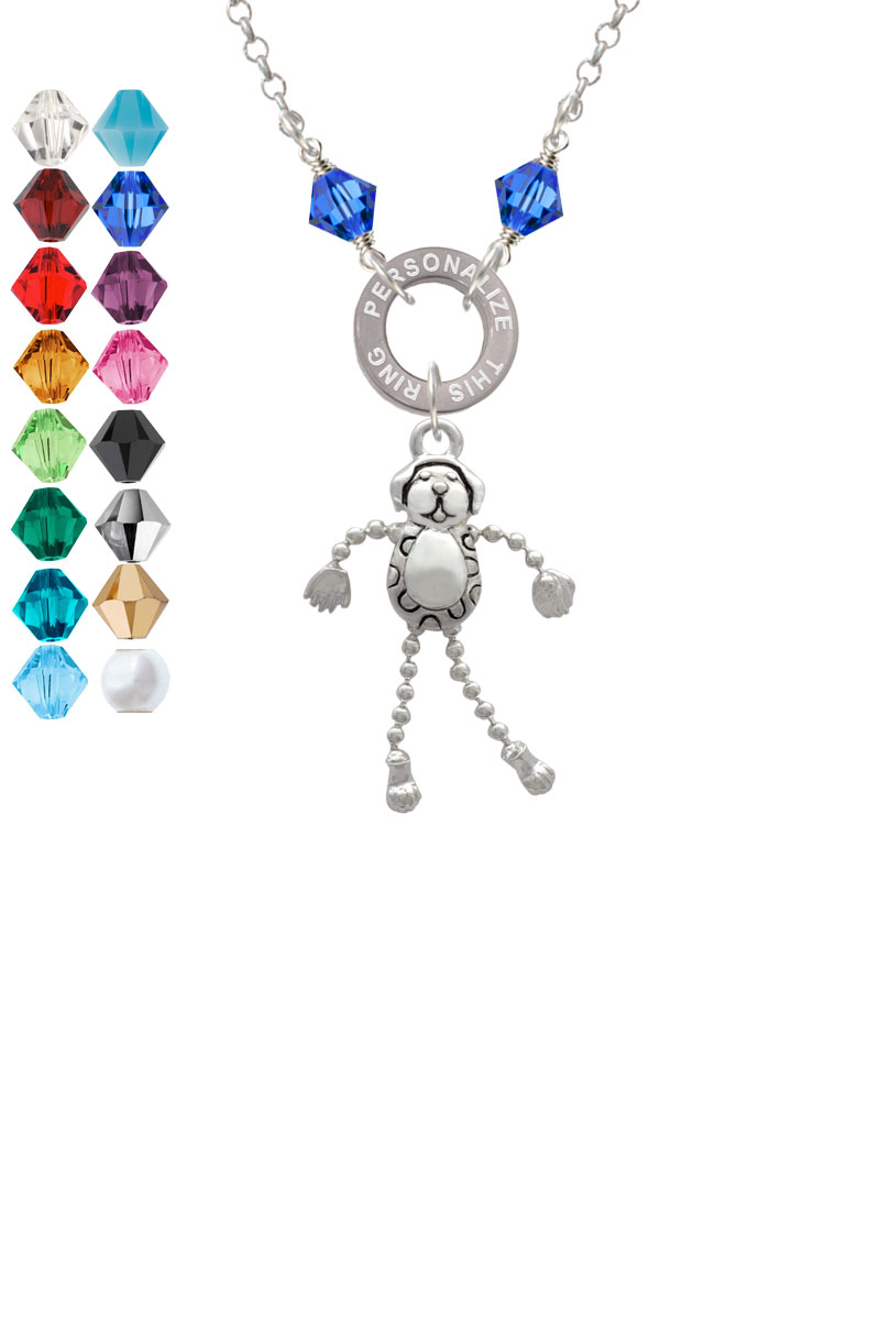 Silver Tone Dog with 4 Dangle legs Custom Engraved Name Ring Crystal Necklace. Silver Tone Charms. Charm size is approx. 1.27 x 0.96 x 0.132 inches (HxWxD) including loop. 1.5mm Rolo Chain Necklace is 20 inches long. Eternity Ring is approximately 0.52 x 0.52 x 0.5 inches (HxWxD). 6mm Crystal Bicones are wrapped by hand. Lobster Claw Clasp. Personalized Stainless Steel Eternity Ring is 0.52 x 0.52 x 0.5 inches (HxWxD) can be engraved up to 25 Letters (including spaces). Select different crystal colors to represent children birthday month colors, school colors, and sports teams. Engraving is a wonderful way to record special dates. Please Note: Our products are lead safe, but are not intended for children 14 years and younger.