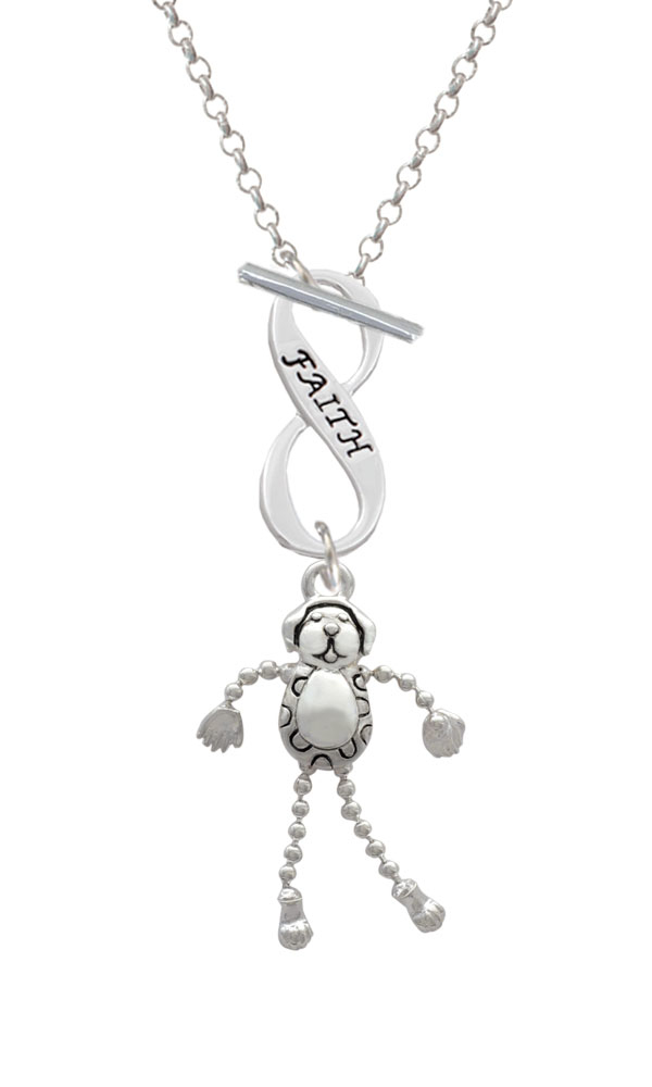 Silver Tone Dog with 4 Dangle legs Faith Infinity Toggle Necklace. Silver Tone Charms. Charm size is approx. 1.27 x 0.96 x 0.132 inches (HxWxD) including loop. 3mm Rolo Chain Necklace is 18 inches long. Infinity Toggle is approx. 0.90 x 0.40 x 0.10 inches (HxWxD). The infinity symbol represents the quality of being limitless or endless. Choose your favorite message to represent your love, faith, or commitment that lasts forever. Please Note: Our products are lead safe, but are not intended for children 14 years and younger.