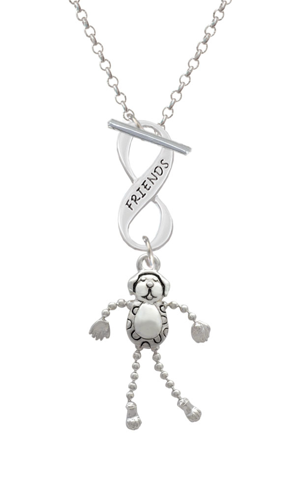 Silver Tone Dog with 4 Dangle legs Friends Infinity Toggle Necklace. Silver Tone Charms. Charm size is approx. 1.27 x 0.96 x 0.132 inches (HxWxD) including loop. 3mm Rolo Chain Necklace is 18 inches long. Infinity Toggle is approx. 0.90 x 0.40 x 0.10 inches (HxWxD). The infinity symbol represents the quality of being limitless or endless. Choose your favorite message to represent your love, faith, or commitment that lasts forever. Please Note: Our products are lead safe, but are not intended for children 14 years and younger.