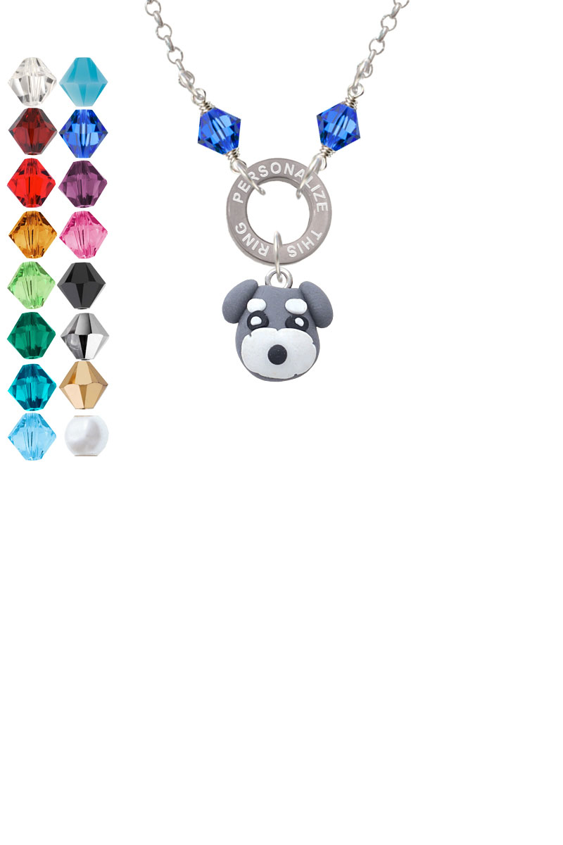 Handmade 3-D Fimo Clay Puppy Dog Custom Engraved Name Ring Crystal Necklace. Fimo Clay Puppy Dog is approximately 0.55 x 0.58 x 0.49 inches (HxWxD). Adorable gift for dog lovers. 1.5mm Rolo Chain Necklace is 20 inches long. Eternity Ring is approximately 0.52 x 0.52 x 0.5 inches (HxWxD). 6mm Crystal Bicones are wrapped by hand. Lobster Claw Clasp. Personalized Stainless Steel Eternity Ring is 0.52 x 0.52 x 0.5 inches (HxWxD) can be engraved up to 25 Letters (including spaces). Select different crystal colors to represent children birthday month colors, school colors, and sports teams. Engraving is a wonderful way to record special dates. Please Note: Our products are lead safe, but are not intended for children 14 years and younger.