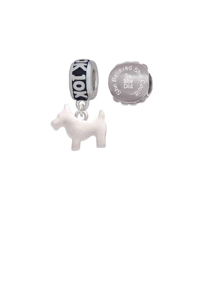 Silvertone Flat Scottie Dog 10K Run She Believed She Could Charm Beads (Set of 2). Charm size is approx. 0.56 x 0.63 x 0.08 inches (HxWxD) including loop. 10K Charm Hanger Bead is approx. 12x6x12 mm (HxWxD) Hole size: 5.5 mm. Our Charm Beads are compatible with most Charm Bead Bracelets. Also makes a great charms pendant. She Believed She Could So She Did Engraved Stainless Steel Bead is approx. 13x13x9 mm (HxWxD) Hole size 5.5 mm. Wonderful running jewelry beads. Please Note: Our products are lead safe, but are not intended for children 14 years and younger.