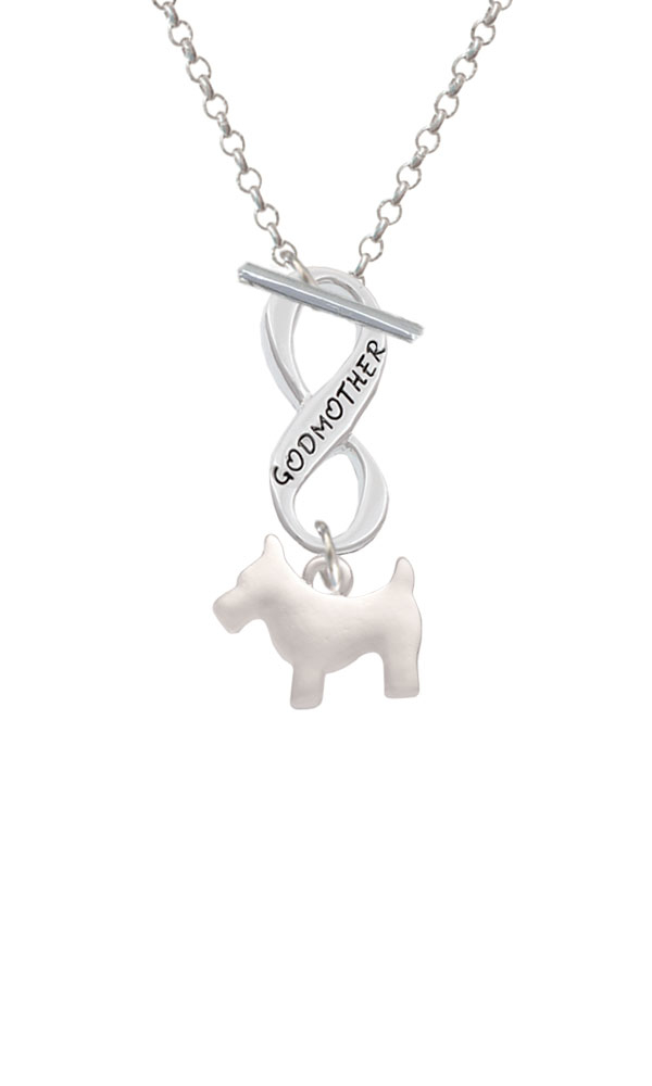 Silver Tone Flat Scottie Dog Godmother Infinity Toggle Necklace. Silver Tone Charm. Charm size is approx. 0.56 x 0.63 x 0.08 inches (HxWxD) including loop. 3mm Rolo Chain Necklace is 18 inches long. Infinity Toggle is approx. 0.90 x 0.40 x 0.10 inches (HxWxD). The infinity symbol represents the quality of being limitless or endless. Choose your favorite message to represent your love, faith, or commitment that lasts forever. Please Note: Our products are lead safe, but are not intended for children 14 years and younger.