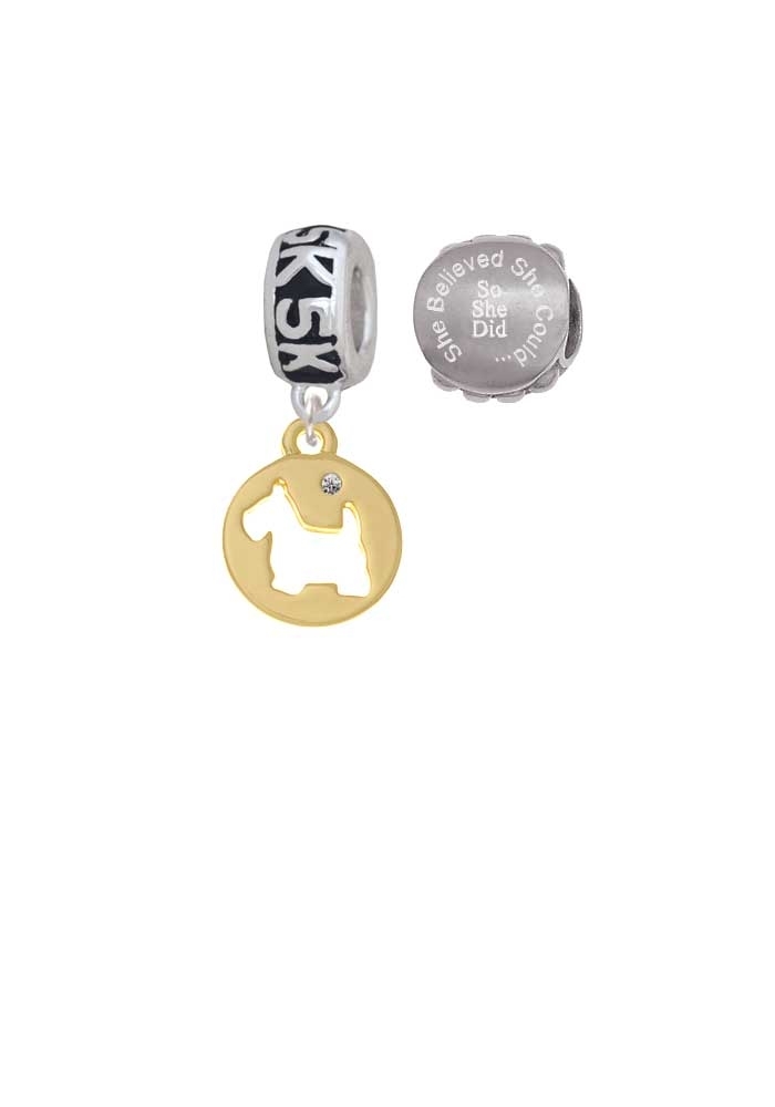 Goldtone Scottie Dog Silhouette 5K Run She Believed She Could Charm Beads (Set of 2). Goldtone Scottie Dog Silhouette is approximately 0.64 x 0.53 x 0.09 inches (HxWxD) including loop. Smooth disc has a Scottish Terrier Cutout with a clear crystal on the front. 5K Charm Hanger Bead is approx. 12x6x12 mm (HxWxD) Hole size: 5.5 mm. Our Charm Beads are compatible with most Charm Bead Bracelets. Also makes a great charms pendant. She Believed She Could So She Did Engraved Stainless Steel Bead is approx. 13x13x9 mm (HxWxD) Hole size 5.5 mm. Wonderful running jewelry beads. Please Note: Our products are lead safe, but are not intended for children 14 years and younger.