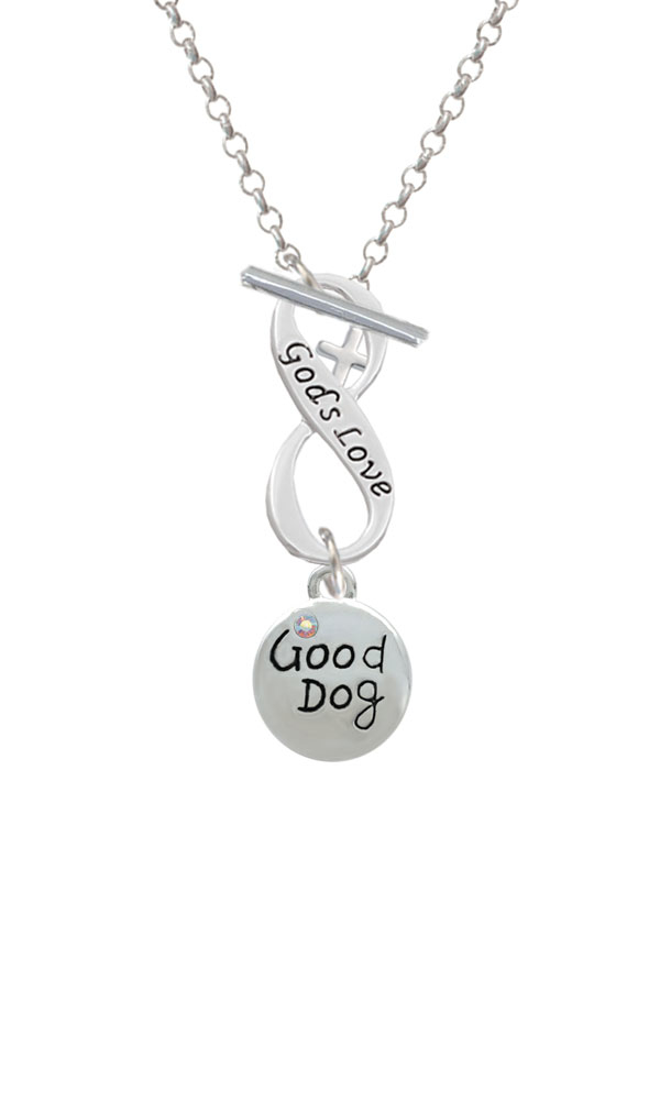 Silver Tone Good Dog with AB Crystal and Paw Print God’s Love Infinity Toggle Necklace. Silver Tone charms. Charm size is approx. 0.58 x 0.47 x 0.1 inches (HxWxD) including loop. 3mm Rolo Chain Necklace is 18 inches long. Infinity Toggle is approx. 0.90 x 0.40 x 0.10 inches (HxWxD). The infinity symbol represents the quality of being limitless or endless. Choose your favorite message to represent your love, faith, or commitment that lasts forever. Please Note: Our products are lead safe, but are not intended for children 14 years and younger.