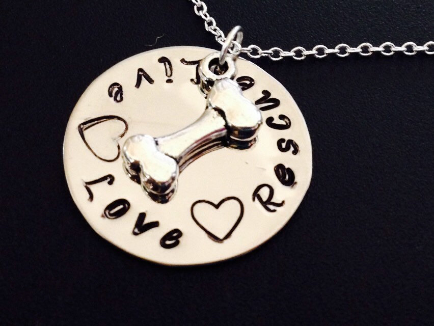 ~ This necklace features the words Live Love Rescue and an adorable dog bone charm. We have adopted many animals over the years and will continue to rescue animals in need of a home. Often times after rescuing an animal you find out they really rescued you. They not only bring joy and love into our homes but they also look over and protect us. ~ This pendant is a 1″ disc (22 gauge) stainless steel. ~~~~~~ What I Need TO Complete Your ONE OF A Kind Necklace ~~~~~~ ~ When ordering please include the following information in “note to seller”, a convo or email: * the words you want stamped – if different than the example (the names including spacing can not exceed 20 characters) ★ *˚* °♥ ˚ • ★ *˚ .* °♥ ˚ • ★ *˚ . * °♥ ˚ • ★ *˚ .* ★ *˚* °♥ ˚ • ★ *˚ .* °♥ ˚ • ★ *˚ . * °♥ This makes a wonderful holiday gift, birthday gift. ***************If you have any questions, please contact me before purchasing.************* ———Your new necklace will be beautifully packaged in a gift box all set to give. If there is something you would like and do not see, including quantity or you want to add or take out any Charm/disk/pearl/birthstone/color/Chain length or Keychain please feel free to convo me and I can create a custom listing for you. Custom orders are welcomed! Additional charms are available as a separate listing : https://www.etsy.com/listing/218294242/add-on-additional-swarovski-round?ref=shop_home_active_1 This disk is Stainless steel, Stainless steel is a perfect alternative to the more costly sterling with all the hypoallergenic properties you demand. Stainless steel will not rust, tarnish, and is very wear resistant. This necklace will last a lifetime. All of my stamped jewelry is hand stamped by me. This being said it is custom made for you with care and quality in mind. With each letter being stamped into the metal individually there will be variation between depth, spacing, and alignment. Each piece will be a unique one of a kind treasure,sometimes letters may not seem completely aligned or straight and this is part of the nature of the piece and it’s what it makes them so special. Personalized jewelry is non-refundable. Check all sizes and reference charts above before purchasing. *If you need a larger quantity than the one listed, please email me via Etsy. SEE ALL OF MY Beautiful, Handcrafted, Personalized Jewelry: www.etsy.com/shop/ashijewelers → Connect With ME ← Facebook Fan Page, be sure to like my shop to be the first to know about coupon codes and new pieces: ✓ Like this shop on Facebook: www.facebook.com/ashijeweler ✓ Follow this shop on Pinterest: https://www.pinterest.com/ashijewelers Thank you for shopping Hand-made 🙂