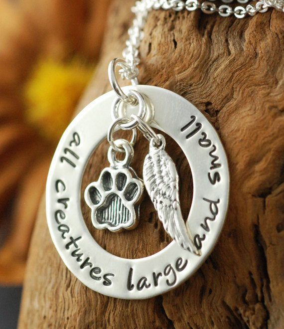 This Necklace consists of … 1″ sterling silver washer 20gauge very thick and sturdy Sterling Silver dog paw charm Sterling Silver wing charm 16″ or 18″ sterling silver flat cable chain. Please provide your detailed info at checkout in the “message to seller” box in Etsy. Such as, what you would like stamped on the washer such as name(s), word(s), or phrase, and size chain. Each pendant and stamping are done by hand so please know that each letter or name might not line up perfectly. Also, some letters might be deeper than others. This is not a defect. It adds character to each piece. Made with sterling silver materials. Custom orders are welcome! If you would like different charms, crystals etc. Please convo me! Thanks for shopping. Annie Reh