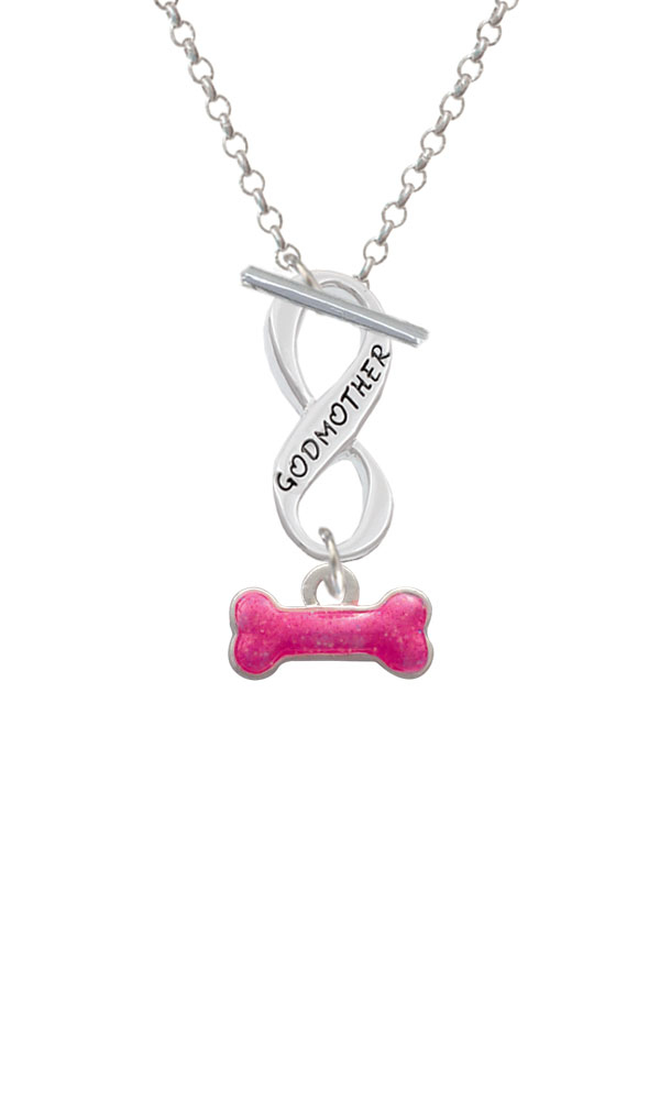 Silver Tone Hot Pink Glitter Dog Bone Godmother Infinity Toggle Necklace. Silver Tone, hand enameled charms. Charm size is approx. 0.38 x 0.64 x 0.08 inches (HxWxD) including loop. 3mm Rolo Chain Necklace is 18 inches long. Infinity Toggle is approx. 0.90 x 0.40 x 0.10 inches (HxWxD). The infinity symbol represents the quality of being limitless or endless. Choose your favorite message to represent your love, faith, or commitment that lasts forever. Please Note: Our products are lead safe, but are not intended for children 14 years and younger.