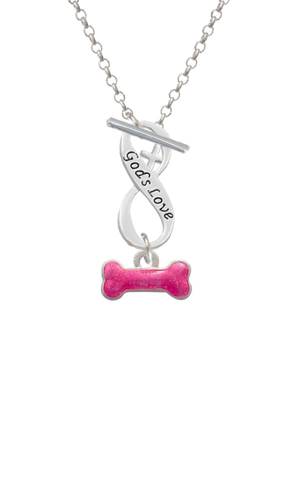 Silver Tone Hot Pink Glitter Dog Bone God’s Love Infinity Toggle Necklace. Silver Tone, hand enameled charms. Charm size is approx. 0.38 x 0.64 x 0.08 inches (HxWxD) including loop. 3mm Rolo Chain Necklace is 18 inches long. Infinity Toggle is approx. 0.90 x 0.40 x 0.10 inches (HxWxD). The infinity symbol represents the quality of being limitless or endless. Choose your favorite message to represent your love, faith, or commitment that lasts forever. Please Note: Our products are lead safe, but are not intended for children 14 years and younger.