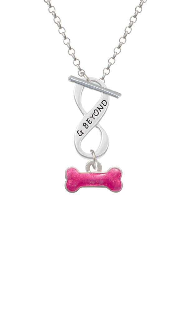 Silver Tone Hot Pink Glitter Dog Bone Infinity and Beyond Toggle Necklace. Silver Tone, hand enameled charms. Charm size is approx. 0.38 x 0.64 x 0.08 inches (HxWxD) including loop. 3mm Rolo Chain Necklace is 18 inches long. Infinity Toggle is approx. 0.90 x 0.40 x 0.10 inches (HxWxD). The infinity symbol represents the quality of being limitless or endless. Choose your favorite message to represent your love, faith, or commitment that lasts forever. Please Note: Our products are lead safe, but are not intended for children 14 years and younger.