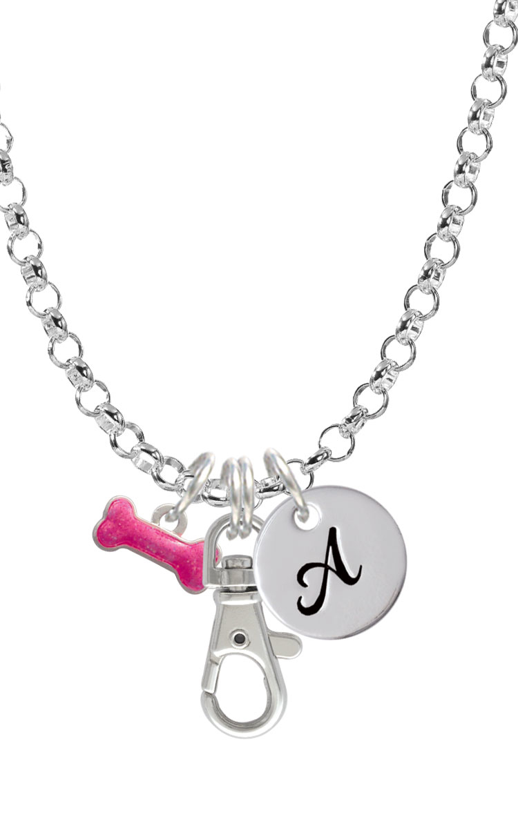 Silver Tone Hot Pink Glitter Dog Bone Initial Badge Clip Necklace. Silver Tone, hand enameled charms. Charm size is approx. 0.38 x 0.64 x 0.08 inches (HxWxD) including loop. 5 mm Rolo Chain Necklace: 34 Inches. Large Swivel Clip is approx. 1.43 x 0.65 x 0.25 Inches (HxWxD). Dress up your ID with this beautiful and unique necklace. Please Note: Our products are lead safe, but are not intended for children 14 years and younger.
