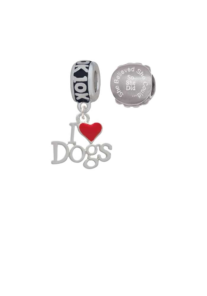 Silvertone I love Dogs with Red Heart 10K Run She Believed She Could Charm Beads (Set of 2). Charm size is approx. 0.62 x 0.68 x 0.09 inches (HxWxD) including loop. 10K Charm Hanger Bead is approx. 12x6x12 mm (HxWxD) Hole size: 5.5 mm. Our Charm Beads are compatible with most Charm Bead Bracelets. Also makes a great charms pendant. She Believed She Could So She Did Engraved Stainless Steel Bead is approx. 13x13x9 mm (HxWxD) Hole size 5.5 mm. Wonderful running jewelry beads. Please Note: Our products are lead safe, but are not intended for children 14 years and younger.
