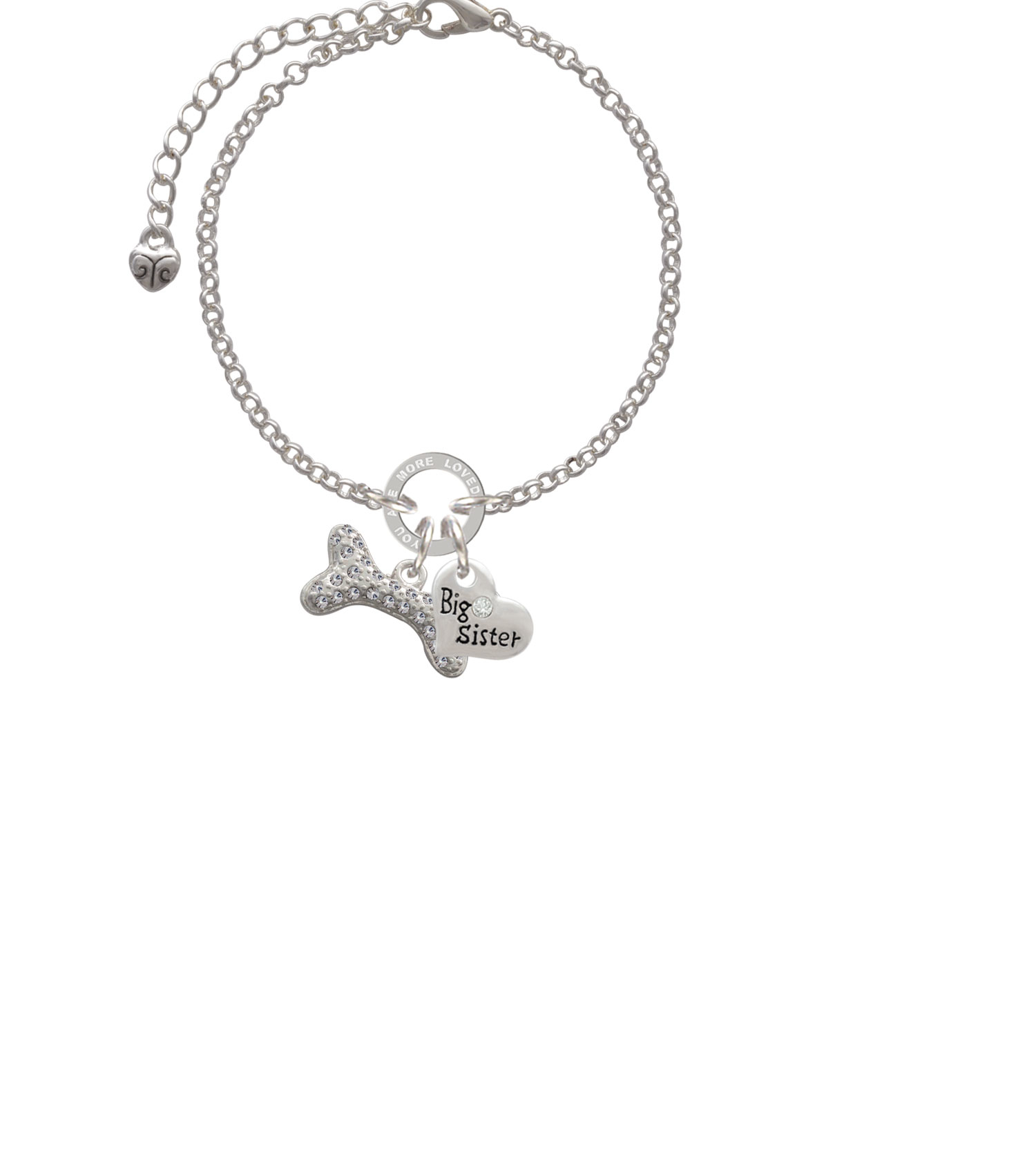 Silver Tone Large Clear Crystal Dog Bone You Are Loved Circle Bracelet. Silver Tone, hand enameled Charms. Charm size is approx. 0.46 x 0.86 x 0.11 inches (HxWxD) including loop. Bracelet is adjustable from 6.5 to 8 inches. Small Family Heart is approximately 0.57 x 0.53 x 0.12 inches (HxWxD) not including loop. Back features an antiqued flower pattern. You Are More Loved Than You Will Ever Know Circle is approximately 0.50 x 0.50 x 0.10 inches (HxWxD). You Are More Loved Than You Will Ever Know Eternity Circle is symbolic for endless belief in the message that is imprinted around the ring. Heart Styles: Grandmother, Mother, Mom, Daughter Aunt, Niece, Sister, Big Sister, Lil Sister, Godmother, Wife, Best Friend, Coach, Wonder Woman, True Love Waits, Happy Birthday, and Lord Guide Me. Makes a great gift! Please Note: Our products are lead safe, but are not intended for children 14 years and younger.