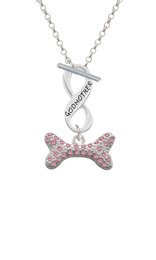 Silver Tone Large Light Pink Crystal Dog Bone Godmother Infinity Toggle Necklace. Silver Tone, hand enameled charms. Charm size is approx. 0.45 x 0.86 x 0.11 inches (HxWxD) including loop. 3mm Rolo Chain Necklace is 18 inches long. Infinity Toggle is approx. 0.90 x 0.40 x 0.10 inches (HxWxD). The infinity symbol represents the quality of being limitless or endless. Choose your favorite message to represent your love, faith, or commitment that lasts forever. Please Note: Our products are lead safe, but are not intended for children 14 years and younger.