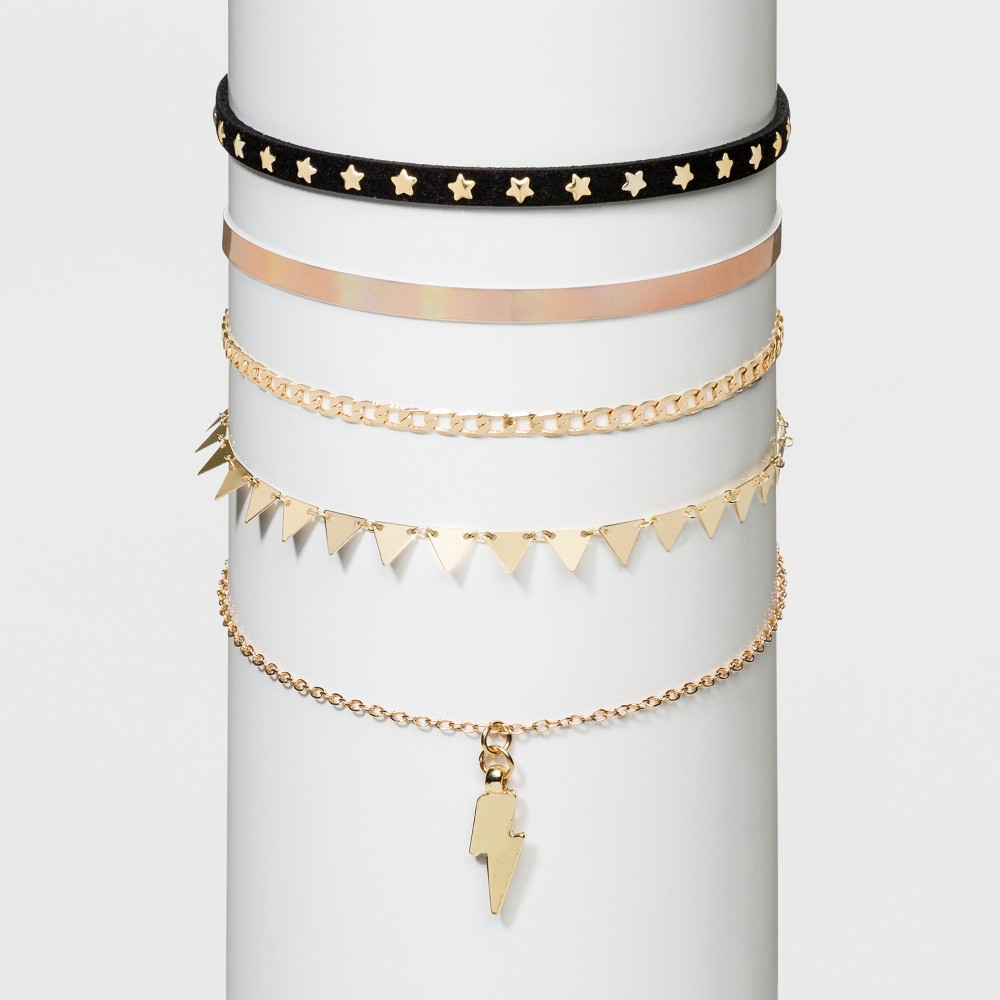 Choker set with metal and fabric construction. Gold-finished chain chokers with different styles – interlocking triangles, rolo chain with lightning bolt and simple curb. Also includes black faux-leather choker necklace with gold-finished stars and iridescent ribbon. Color: Gold. Gender: Female. Pattern: Solid.