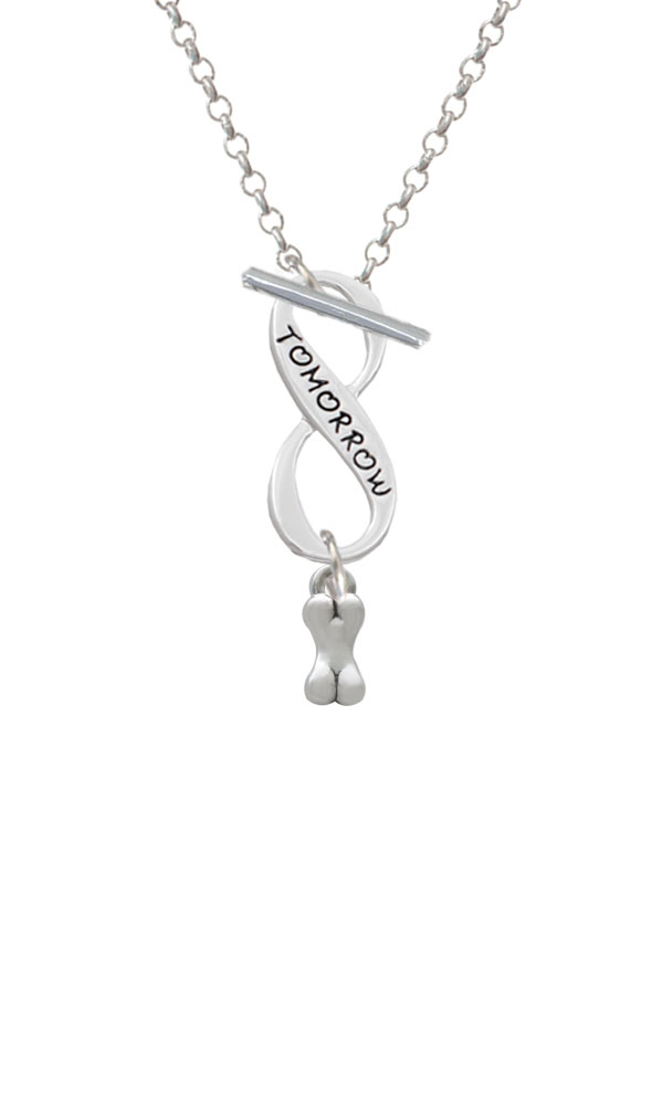 Silver Tone Mini 3-D Dog Bone Today Tomorrow Infinity Toggle Necklace. Silver Tone, hand enameled charms. Charm size is approx. 0.42 x 0.17 x 0.07 inches (HxWxD) including loop. 3mm Rolo Chain Necklace is 18 inches long. Infinity Toggle is approx. 0.90 x 0.40 x 0.10 inches (HxWxD). The infinity symbol represents the quality of being limitless or endless. Choose your favorite message to represent your love, faith, or commitment that lasts forever. Please Note: Our products are lead safe, but are not intended for children 14 years and younger.
