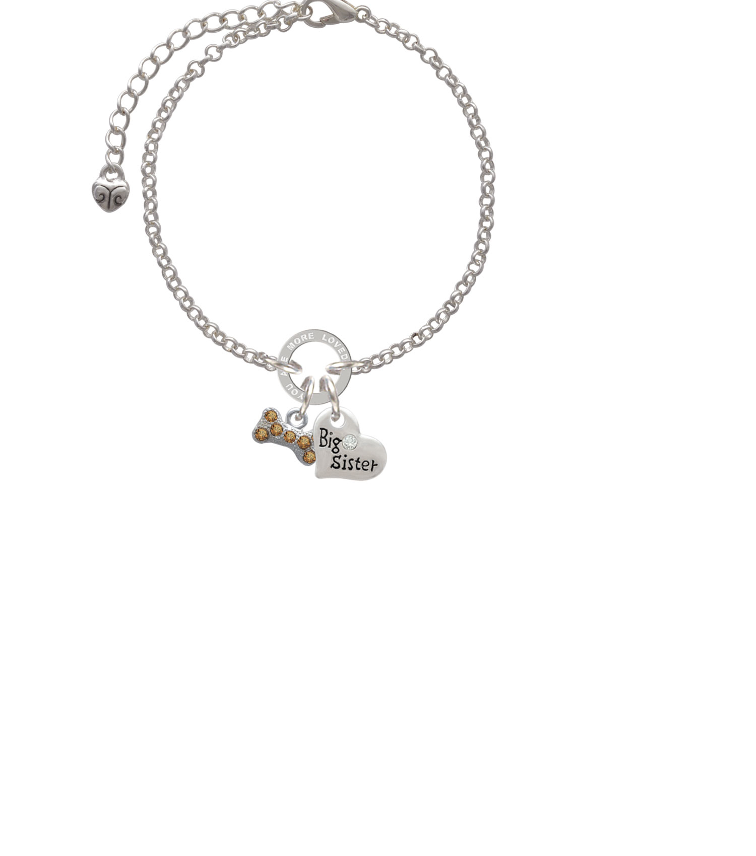 Silver Tone Mini Brown Crystal Dog Bone You Are Loved Circle Bracelet. Silver Tone Charms. Charm size is approx. 0.32 x 0.47 x 0.1 inches (HxWxD) including loop. Bracelet is adjustable from 6.5 to 8 inches. Small Family Heart is approximately 0.57 x 0.53 x 0.12 inches (HxWxD) not including loop. Back features an antiqued flower pattern. You Are More Loved Than You Will Ever Know Circle is approximately 0.50 x 0.50 x 0.10 inches (HxWxD). You Are More Loved Than You Will Ever Know Eternity Circle is symbolic for endless belief in the message that is imprinted around the ring. Heart Styles: Grandmother, Mother, Mom, Daughter Aunt, Niece, Sister, Big Sister, Lil Sister, Godmother, Wife, Best Friend, Coach, Wonder Woman, True Love Waits, Happy Birthday, and Lord Guide Me. Makes a great gift! Please Note: Our products are lead safe, but are not intended for children 14 years and younger.