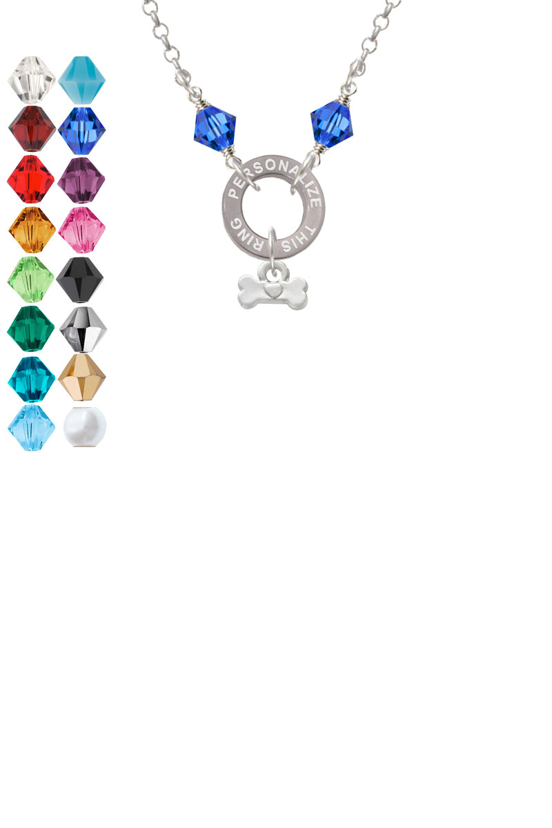 Silver Tone Mini Dog Bone with Heart Custom Engraved Name Ring Crystal Necklace. Silver Tone, hand enameled Charms. Charm size is approx. 0.24 x 0.32 x 0.08 inches (HxWxD) including loop. 1.5mm Rolo Chain Necklace is 20 inches long. Eternity Ring is approximately 0.52 x 0.52 x 0.5 inches (HxWxD). 6mm Crystal Bicones are wrapped by hand. Lobster Claw Clasp. Personalized Stainless Steel Eternity Ring is 0.52 x 0.52 x 0.5 inches (HxWxD) can be engraved up to 25 Letters (including spaces). Select different crystal colors to represent children birthday month colors, school colors, and sports teams. Engraving is a wonderful way to record special dates. Please Note: Our products are lead safe, but are not intended for children 14 years and younger.