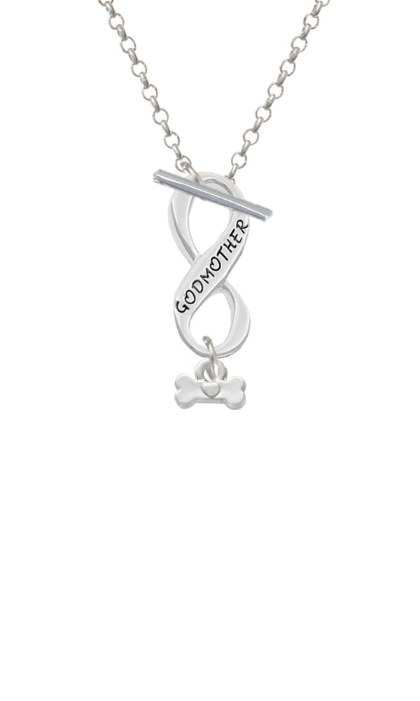 Silver Tone Mini Dog Bone with Heart Godmother Infinity Toggle Necklace. Silver Tone, hand enameled charms. Charm size is approx. 0.24 x 0.32 x 0.08 inches (HxWxD) including loop. 3mm Rolo Chain Necklace is 18 inches long. Infinity Toggle is approx. 0.90 x 0.40 x 0.10 inches (HxWxD). The infinity symbol represents the quality of being limitless or endless. Choose your favorite message to represent your love, faith, or commitment that lasts forever. Please Note: Our products are lead safe, but are not intended for children 14 years and younger.