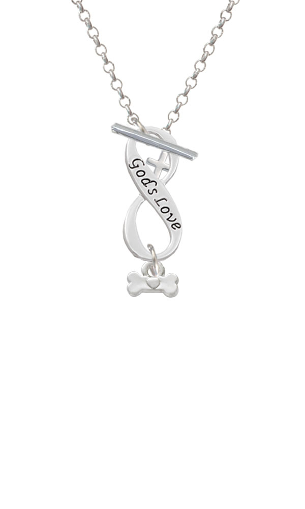 Silver Tone Mini Dog Bone with Heart God’s Love Infinity Toggle Necklace. Silver Tone, hand enameled charms. Charm size is approx. 0.24 x 0.32 x 0.08 inches (HxWxD) including loop. 3mm Rolo Chain Necklace is 18 inches long. Infinity Toggle is approx. 0.90 x 0.40 x 0.10 inches (HxWxD). The infinity symbol represents the quality of being limitless or endless. Choose your favorite message to represent your love, faith, or commitment that lasts forever. Please Note: Our products are lead safe, but are not intended for children 14 years and younger.