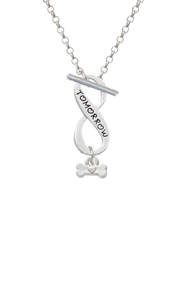 Silver Tone Mini Dog Bone with Heart Today Tomorrow Infinity Toggle Necklace. Silver Tone, hand enameled charms. Charm size is approx. 0.24 x 0.32 x 0.08 inches (HxWxD) including loop. 3mm Rolo Chain Necklace is 18 inches long. Infinity Toggle is approx. 0.90 x 0.40 x 0.10 inches (HxWxD). The infinity symbol represents the quality of being limitless or endless. Choose your favorite message to represent your love, faith, or commitment that lasts forever. Please Note: Our products are lead safe, but are not intended for children 14 years and younger.