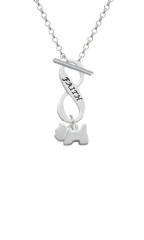 Silver Tone Mini Scottie Dog Faith Infinity Toggle Necklace. Silver Tone, hand enameled charms. Charm size is approx. 0.35 x 0.48 x 0.07 inches (HxWxD) including loop. 3mm Rolo Chain Necklace is 18 inches long. Infinity Toggle is approx. 0.90 x 0.40 x 0.10 inches (HxWxD). The infinity symbol represents the quality of being limitless or endless. Choose your favorite message to represent your love, faith, or commitment that lasts forever. Please Note: Our products are lead safe, but are not intended for children 14 years and younger.