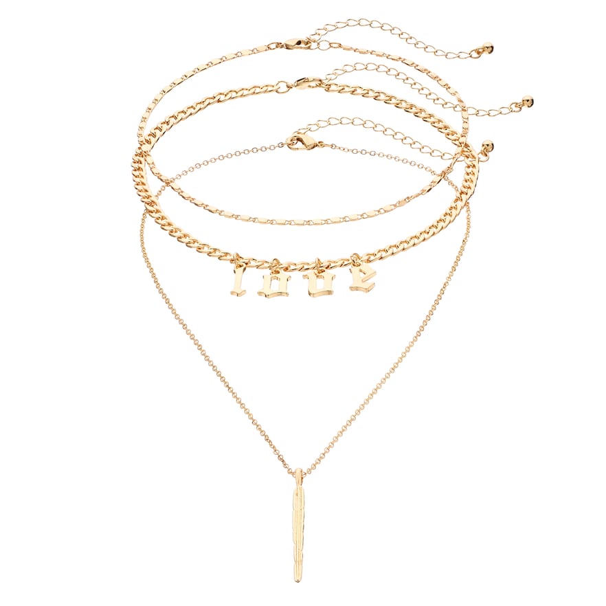 Let your style speak for itself with this Mudd necklace set, featuring letter charms and a feather pendant.SET Details Includes: 3 necklaces Length: 12-16 in. with 3-in. extender (each) Pendant length: 2 in. Clasp: lobster-claw Metal: iron, zinc alloy Plating: gold tone Inscription: “Love” Additional details: nickel free Not appropriate for children 14 years old and younger. Size: One Size. Gender: Female. Age Group: Adult.