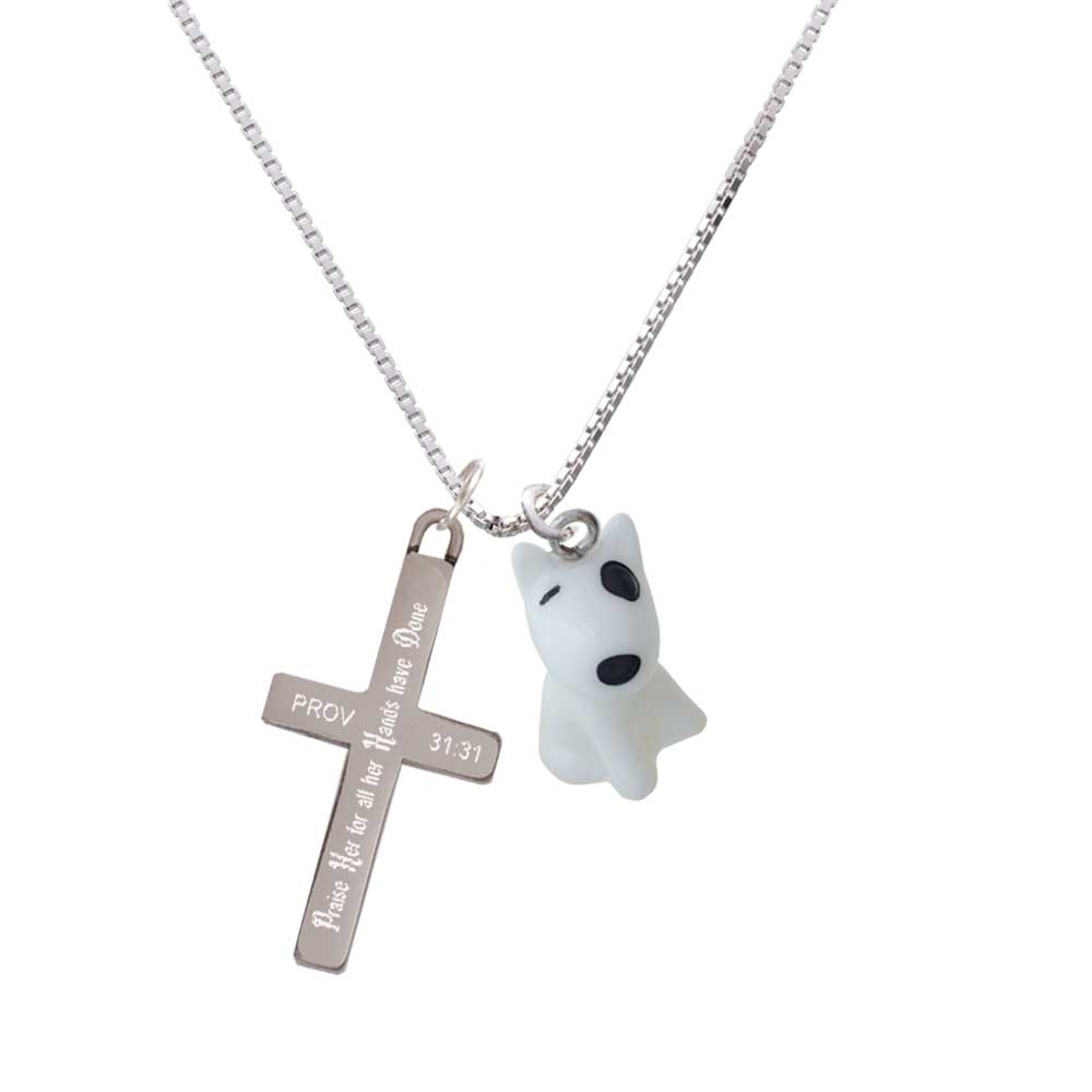 Hand Painted Resin White Bull Terrier Dog – Praise Her – Cross Necklace. Resin White Bull Terrier Dog is approximately 0.92 x 0.51 x 0.50 inches (HxWxD). Light weight alternative to metal Charms. 1.3mm Box Chain necklace is 18″+2″ Extender. Lobster claw clasp. Stainless Steel Cross is approx. 1.3 inches long. Engraved Bible verse Proverbs 31:31 – Honor her for all that her hands have done, and let her works bring her praise at the city gate. Please Note: Our products are lead safe, but are not intended for children 14 years and younger.