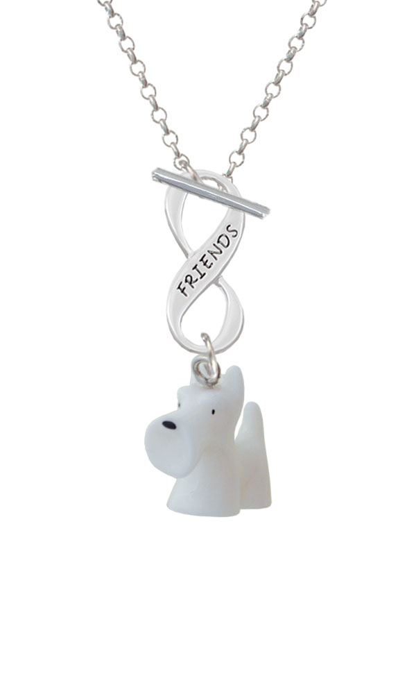 Hand Painted Resin White Scottie Dog Friends Infinity Toggle Necklace. Resin White Scottie Dog is approximately 0.79 x 0.31 x 0.87 inches (HxWxD). Light weight alternative to metal charms. 3mm Rolo Chain Necklace is 18 inches long. Infinity Toggle is approx. 0.90 x 0.40 x 0.10 inches (HxWxD). The infinity symbol represents the quality of being limitless or endless. Choose your favorite message to represent your love, faith, or commitment that lasts forever. Please Note: Our products are lead safe, but are not intended for children 14 years and younger.