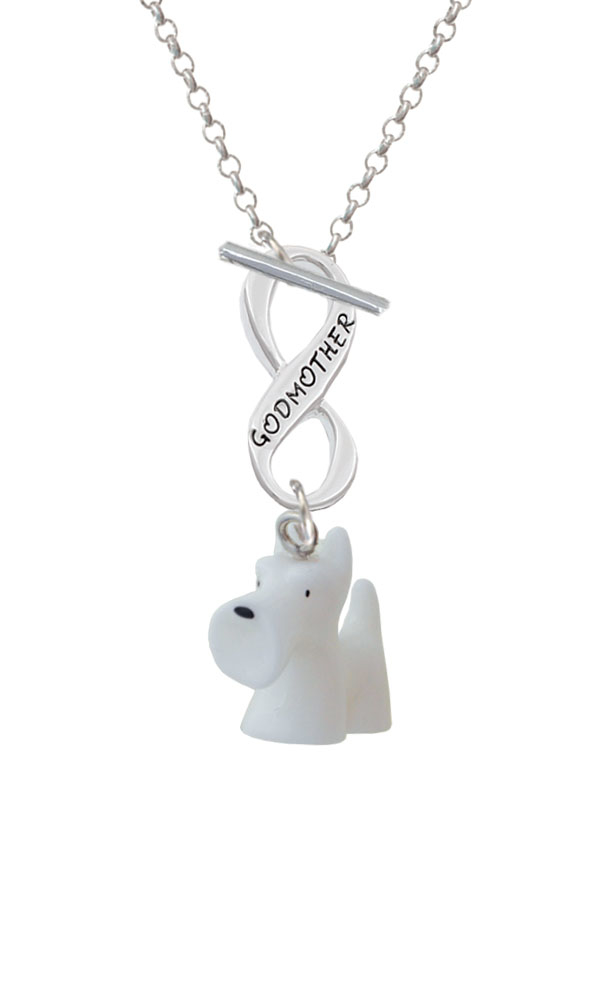 Hand Painted Resin White Scottie Dog Godmother Infinity Toggle Necklace. Resin White Scottie Dog is approximately 0.79 x 0.31 x 0.87 inches (HxWxD). Light weight alternative to metal charms. 3mm Rolo Chain Necklace is 18 inches long. Infinity Toggle is approx. 0.90 x 0.40 x 0.10 inches (HxWxD). The infinity symbol represents the quality of being limitless or endless. Choose your favorite message to represent your love, faith, or commitment that lasts forever. Please Note: Our products are lead safe, but are not intended for children 14 years and younger.