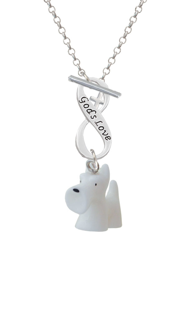 Hand Painted Resin White Scottie Dog God’s Love Infinity Toggle Necklace. Resin White Scottie Dog is approximately 0.79 x 0.31 x 0.87 inches (HxWxD). Light weight alternative to metal charms. 3mm Rolo Chain Necklace is 18 inches long. Infinity Toggle is approx. 0.90 x 0.40 x 0.10 inches (HxWxD). The infinity symbol represents the quality of being limitless or endless. Choose your favorite message to represent your love, faith, or commitment that lasts forever. Please Note: Our products are lead safe, but are not intended for children 14 years and younger.