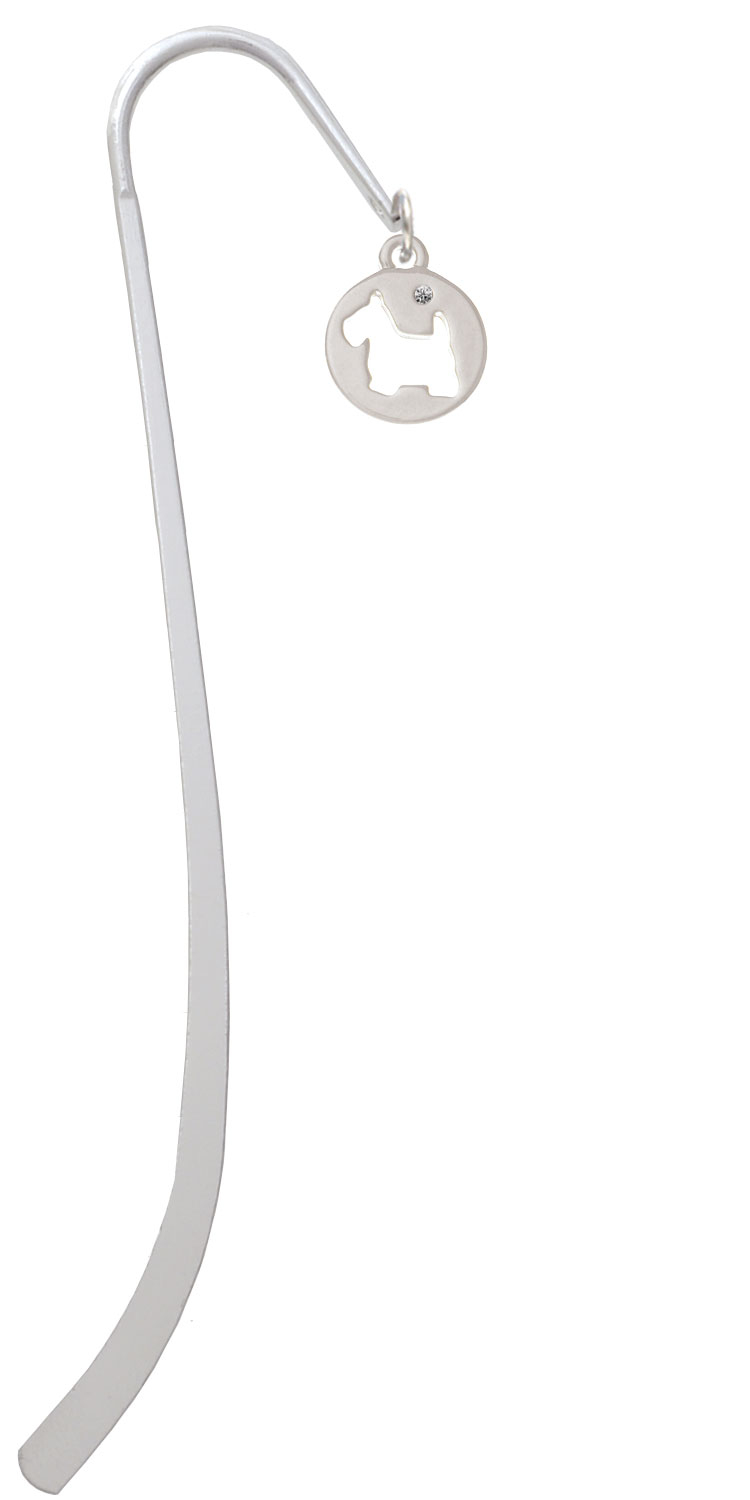Silver Tone Scottie Dog Silhouette Charm Bookmark. Silver Tone Scottie Dog Silhouette is approximately 0.64 x 0.53 x 0.09 inches (HxWxD) including loop. Smooth disc has a Scottish Terrier Cutout with a clear crystal on the front. Silver Plated Bookmark is 5 inches long. Great Bible Gift or Torah Gift. Also available as a necklace, and bracelet. Please Note: Our products are lead safe, but are not intended for children 14 years and younger.