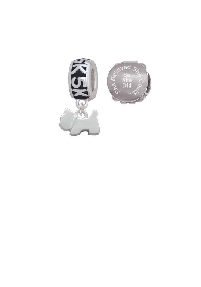 Silvertone Mini Scottie Dog 5K Run She Believed She Could Charm Beads (Set of 2). Charm size is approx. 0.35 x 0.48 x 0.07 inches (HxWxD) including loop. 5K Charm Hanger Bead is approx. 12x6x12 mm (HxWxD) Hole size: 5.5 mm. Our Charm Beads are compatible with most Charm Bead Bracelets. Also makes a great charms pendant. She Believed She Could So She Did Engraved Stainless Steel Bead is approx. 13x13x9 mm (HxWxD) Hole size 5.5 mm. Wonderful running jewelry beads. Please Note: Our products are lead safe, but are not intended for children 14 years and younger.