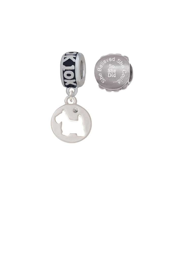 Silvertone Scottie Dog Silhouette 10K Run She Believed She Could Charm Beads (Set of 2). Silvertone Scottie Dog Silhouette is approximately 0.64 x 0.53 x 0.09 inches (HxWxD) including loop. Smooth disc has a Scottish Terrier Cutout with a clear crystal on the front. 10K Charm Hanger Bead is approx. 12x6x12 mm (HxWxD) Hole size: 5.5 mm. Our Charm Beads are compatible with most Charm Bead Bracelets. Also makes a great charms pendant. She Believed She Could So She Did Engraved Stainless Steel Bead is approx. 13x13x9 mm (HxWxD) Hole size 5.5 mm. Wonderful running jewelry beads. Please Note: Our products are lead safe, but are not intended for children 14 years and younger.