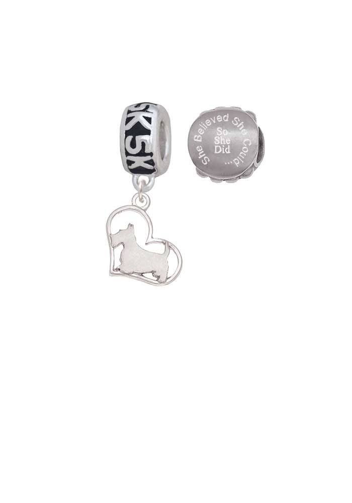 Silvertone Scottie Dog Silhouette Heart 5K Run She Believed She Could Charm Beads (Set of 2). Silvertone Scottie Dog Silhouette Heart is approx. 0.7 x 0.52 x 0.09 inches (HxWxD) including loop. Scottish Terrier Dog in cutout heart is the same on both sides. 5K Charm Hanger Bead is approx. 12x6x12 mm (HxWxD) Hole size: 5.5 mm. Our Charm Beads are compatible with most Charm Bead Bracelets. Also makes a great charms pendant. She Believed She Could So She Did Engraved Stainless Steel Bead is approx. 13x13x9 mm (HxWxD) Hole size 5.5 mm. Wonderful running jewelry beads. Please Note: Our products are lead safe, but are not intended for children 14 years and younger.