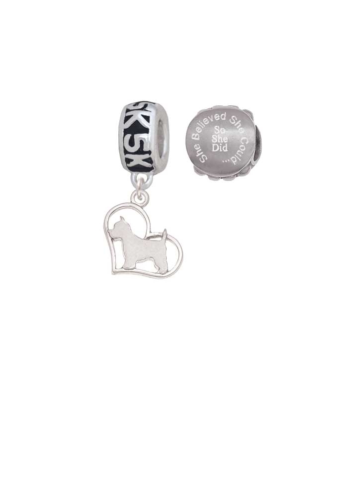 Silvertone Westie Silhouette Heart 5K Run She Believed She Could Charm Beads (Set of 2). Silvertone Westie Silhouette Heart is approx. 0.7 x 0.52 x 0.09 inches (HxWxD) including loop. West Highland Terrier Dog in cutout heart is the same on both sides. 5K Charm Hanger Bead is approx. 12x6x12 mm (HxWxD) Hole size: 5.5 mm. Our Charm Beads are compatible with most Charm Bead Bracelets. Also makes a great charms pendant. She Believed She Could So She Did Engraved Stainless Steel Bead is approx. 13x13x9 mm (HxWxD) Hole size 5.5 mm. Wonderful running jewelry beads. Please Note: Our products are lead safe, but are not intended for children 14 years and younger.