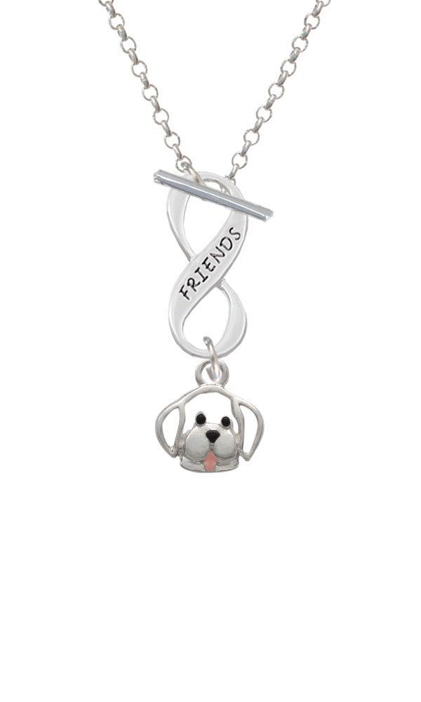 Silver Tone Small Outline Dog Face Friends Infinity Toggle Necklace. Silver Tone, hand enameled charms. Charm size is approx. 0.53 x 0.5 x 0.11 inches (HxWxD) including loop. 3mm Rolo Chain Necklace is 18 inches long. Infinity Toggle is approx. 0.90 x 0.40 x 0.10 inches (HxWxD). The infinity symbol represents the quality of being limitless or endless. Choose your favorite message to represent your love, faith, or commitment that lasts forever. Please Note: Our products are lead safe, but are not intended for children 14 years and younger.
