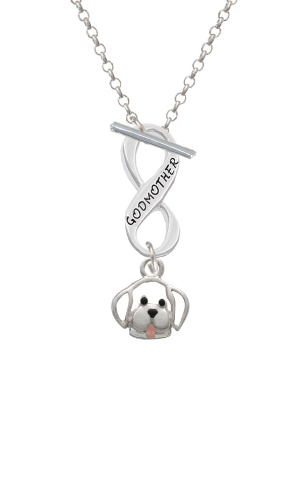 Silver Tone Small Outline Dog Face Godmother Infinity Toggle Necklace. Silver Tone, hand enameled charms. Charm size is approx. 0.53 x 0.5 x 0.11 inches (HxWxD) including loop. 3mm Rolo Chain Necklace is 18 inches long. Infinity Toggle is approx. 0.90 x 0.40 x 0.10 inches (HxWxD). The infinity symbol represents the quality of being limitless or endless. Choose your favorite message to represent your love, faith, or commitment that lasts forever. Please Note: Our products are lead safe, but are not intended for children 14 years and younger.