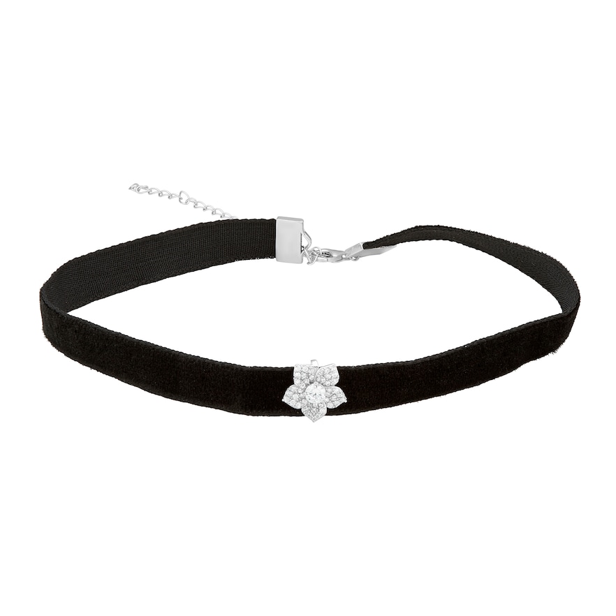 Capture attention with this eye-catching velvet choker necklace. Its cubic zirconia stones and flower design element make it a charming choice.Necklace Details Length: 12 in. with 3-in. extender Clasp: lobster-claw Metal: sterling silver Plating: rhodium Additional details: velvet band Packaging: boxed Cubic Zirconia Details Total weight: 1 ct. Shape: round Setting: pave, prong Gemstones may have been treated to enhance their appearance. Special care may be required. Please visit our Gemstone Treatment & Special Care Guide for more information. Size: 13″. Color: White. Gender: Female. Age Group: Adult. Material: Sterling Silver|Rhodium.