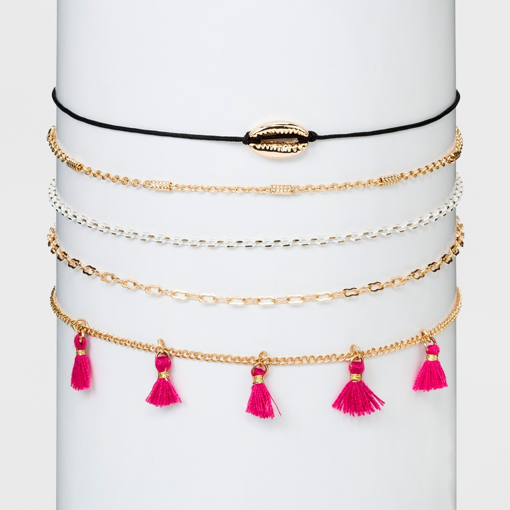 Dare to be different with this five piece choker set! Choose any choker to give your outfit a pop of color. The tassels and conch charm will be sure to get you noticed for your unique sense of style! Color: Gold. Gender: Female. Pattern: Solid.